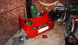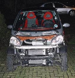 Now it's nearly February 2003, and the Smart is still not mended. I took the front skin off to reveal the naked smart and improvised mounts for the broken headlamp using steel strips. It's back on the commuting run now, and the MX-5 is resting again at 129000km.